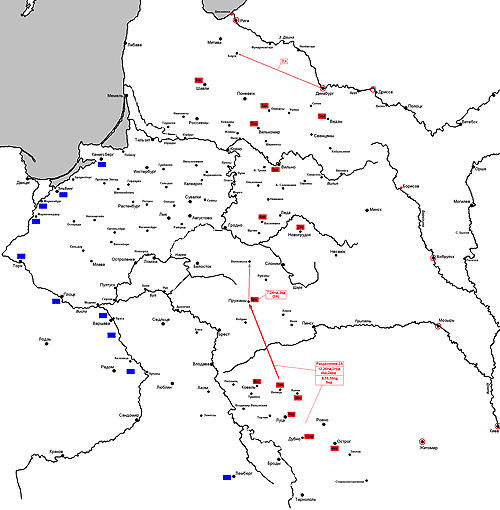 Жерому предписывалось обеспечить защиту Варшавы. Однако оставлять его группу войск даже против одной армии Багратиона (численность которой оценивалась в 100 тысяч человек) было довольно рискованно. Поэтому при необходимости правому крылу должны были содействовать войска Богарне, и, кроме того, с юга приближался корпус Шварценберга. Но необходимо заметить, что этот корпус находился тогда на весьма большом расстоянии от Варшавы. И довольно далеко от этого города располагался также 7-й корпус, так как он был направлен в Люблин с демонстративными целями. Правда, существует мнение, что туда двинулся только его отряд, а прочие войска дислоцировались в районе Радом – Козенице – Пулавы. Тем не менее, сам Наполеон, например, направляя позднее 7-й корпус в Седльце, считал, что он выступит из Люблина.