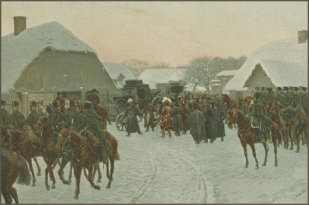 Осенью 1812 г. рано начались холода. Уже в начале октября по утрам случалась изморозь. Днем стояла постоянно хорошая и сухая погода, а в ноябре началась настоящая зима и мороз нередко доходил до 20 градусов. Первыми предвестниками плохого состояния французской армии были разные интендантские чиновники, которые уходили с добычею и с женщинами, из коих многие происходили из высшего польского сословия. Но об отступлении армии еще не было слышно; только в половине ноября полковники польской артиллерии Ридель и Кохановский намекнули об этом, ночуя в доме приходского священника, но не сказали ничего определенного. По истечении нескольких дней, прибывший на ночлег в тот же дом артиллерийский капитан Богданович говорил, что всю армию принудили русские к отступлению и полагал, что Наполеон уже оставил Москву. Под командой капитана было более 40 орудий, которые стояли на площади перед церковью. Другая часть артиллерии, состоявшая из большего числа пушек, была под открытым небом за городом, под командой подполковника Пентки. Когда многие удивились тому, что при отступлении столько еще было орудий, капитан Богданович толковал, что польская артиллерия не лишилась ни одной пушки, т. к. в самом начале зимы приказано подковать артиллерийских лошадей так, как обыкновенно подковывают их в северных странах; французы же держались в этом отношении своих обычаев, и потому принуждены были оставлять пушки во многих местах, по которым они проходили. За артиллерией следовала польская кавалерия, большею частью пешком, в которой можно было заметить большее число офицеров чем солдат. Исключение в этом отношении составлял 4-й конно-егерский полк, в котором было много лошадей, между прочим, у каждого офицера была своя лошадь; все были одеты в церковные ризы, верное доказательство грабежа православных церквей; а у полковника Дульфуса было очень много добычи, состоявшей по преимуществу из дорогих церковных предметов. Т. к. после приезда в Сейны приказал он занять для себя мою квартиру и на моей кровати поместил больного офицера, своего родственника, приказав мне под строгою ответственностью смотреть за ним, то я имел возможность рассмотреть драгоценности, похищенные им в России. Видел я два большие сундука, наполненные иконами, украшенными дорогими камнями; было в сундуках также немало золотых и серебряных церковных сосудов. Независимо от этого, большой тюк женских нарядов, сшитых из дорогих тканей и редких мехов. Сам полковник вечером вместо халата надевал женскую шубку, которая, по-видимому, принадлежала богатой даме, т. к. шубка была покрыта дорогою тканью с золотыми цветами и была на собольем меху лучшего качества; даже панталоны и сюртук у полковника и его родственника были на собольем меху.