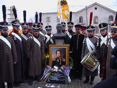 26 октября 2003 г. в подмосковной Вознесенской Давидовой пустыни состоялась церемония перезахоронения генерала от инфантерии Дмитрия Сергеевича Дохтурова - участника Отечественной войны 1812 г. Шеф Московского пехотного полка, герой войны 1812 г. Д.С. Дохтуров был погребен в Давидовой пустыни в 1816 году, в семейном захоронении своей супруги княжны Марии Петровны Оболенской. Еще до революции точное место могилы было утеряно, памятник генерала несколько раз переносили на новое место. Затем кладбище было уничтожено, а колонну, уцелевшую от старого надгробия героя, установили на новом месте, выбранном произвольно. В 2002 году во время снятия грунта на территории пустыни рабочими случайно был вскрыт склеп, находившийся за левым нефом Вознесенского собора. Склеп находился под асфальтом, недалеко от водопроводного колодца. Ничто не указывало на нахождение там захоронения. В склепе были обнаружены человеческие останки. Найденные там золотой нательный крестик, нательный финифтяный медальон с изображением святого Димитрия, митрополита Ростовского, небесного покровителя Дмитрия Сергеевича Дохтурова, и остатки военного мундира с нашивными генеральскими звездами, указывают на то, что это могила славного полководца. На средства Свято-Вознесенской Давидовой пустыни был изготовлен новый памятник, в который встроена колонна с его старого надгробия. Памятник украшен бюстом генерала, переданным в обитель главой сельской администрации С.Д. Анашкиным. Почтить память героя Отечественной войны 1812 года прибыл викарий Московской епархии архиепископ Можайский Григорий, который совершил панихиду по генералу Дохтурову и всем вождям и воинам, павшим за Веру и Отечество. Помимо настоятеля обители игумена Германа и братии, на церемонии перезахоронения присутствовали военные историки и музейные работники из Москвы, Малоярославца, Бородинского музея-заповедника, Багратионовска (Прейсиш-Эйлау), военнослужащие и члены клубов военно-исторической реконструкции, в том числе представители клубов Московского пехотного, Лейб-Гвардии Преображенского и Лейб-Гвардии Семеновского полков. Во главу траурной процессии был вынесен портрет Д.С. Дохтурова. Гроб с останками полководца несли генералы и адмиралы Вооруженных сил России. Следом, с песнопениями, шла церковная братия, а замыкали шествие знаменная группа и строй членов военно-исторических клубов в форме 1812 года. В момент предания останков земле грянул ружейный салют. Строй почетного караула взял ружья «на погребение», знаменосцы склонили древки знамен. Делегации из Прейсиш-Эйлау (ныне Багратионовск), Бородино и Малоярославца бросили в могилу по горсти земли, привезенной с тех полей бывших сражений, где так ярко раскрылся полководческий талант Дмитрия Сергеевича. Души присутствующих переполняла какая-то особая благодать. Будто бы луч неувядаемой славы, обесмертившего свое имя генерала, осветил Давидову пустынь вместе со всеми, кто по зову сердца пришел отдать последние почести герою Отечественной войны 1812 года! ![]() Чины Московского пехотного, Московского гренадерского, Лейб-Гвардии Преображенского и Лейб-Гвардии Семеновского полков и Роты Дворцовых Гренадер у могилы генерала от инфантерии Д.С.Дохтурова. |