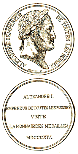 Во время пребывания своего в Париже Император Александр I посетил монетный двор, где в память этого посещения и было отчеканено несколько медалей.