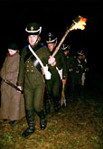На час ночи было назначено выступление в поход. А пока пехота грелась у костра, а французская кавалерия с пением песен раскатывала в манеже коней. 42-м егерским полком по указанию майора Улановича было изготовлено заранее достаточное количество факелов, столь необходимых для ночных маршей. Каждый пехотинцу, помимо ружья пришлось нести по 3-4 факела. И вот наступил час, которого мы так долго ждали. К счастью, погода изменилась в лучшую сторону. На небе высыпали звезды, и луна бросила свой бледный свет на окрестности. Первым выступила объединенная кавалерия. За ней проследовали два обоза в сопровождении французских спешенных гусар. Замыкали колонну 46-й егерский и гвардия. Огни, буйство красок и колорит звуков бразильского карнавала – зрелища самого по себе восхитительно для толпы, - все эти перья, бубны, полуобнаженные тела – тлен и прах по сравнению с незабываемым факельным шествием в ночи по полям и перелескам среднерусской полосы. Колышущийся свет факела в руке наездника вырывает из ночной тьмы кусок проселочной дороги, очерчивает силуэты пехотинцев, затянутых в строгие мундиры. Слышно как громыхает на ухабах обозная повозка и фыркают лошади. Музыкой для уха звучат привычные команды, а над всем властвуют соловьи, выводящие трели где-то совсем рядом. Кажется, что не соловьи, а сама душа твоя поет от ощущений давно желанных. Пусть на одну ночь и один день мы обманем свое время и уйдем этой походной колонной в тот век, в который нам не посчастливилось родиться… Практика подтверждает, что обозы всегда тормозили движение войск. В очередной раз мы убедились в этом. После первого часа движения командование решило пустить обозы с легким прикрытием по другой дороге. Решение было правильным и своевременным т.к. нет ничего хуже ждать и догонять, а в нашем случае - двигаться рваным темпом с частыми остановками. Ночной марш проходил в стороне от населенных пунктов, лишь ближе к утру наша колонна промаршировала мимо дачного поселка и сквозь одну деревню. Только один раз колонна пересекла шоссе. Много бы я отдал, чтобы увидеть выражение лица и послушать впечатления единственного, по причине глубокой ночи, водителя, который видел следующую сцену: по краям шоссе возвышаются с одной стороны гигант-кирасир 5-го в полной экипировке, с другой – Литовский улан с флюгером. Оба освещают переход факелами. В это время дорогу переходит колонна пехоты эпохи наполеоновских войн. Движением руководит дивизионный генерал французской армии. На втором часу пути перед колонной встало неожиданное препятствие в виде свежераспаханного поля щедро омытого непогодой. Высланный разъезд обходной дороги не обнаружил. Пришлось пересекать поле поперек. Удовольствие, надо сказать, еще то! На обратном пути при свете дня мы имели возможность рассмотреть в подробностях это чертово поле. По своей воле только сумасшедший мог бы решиться перейти его – настолько сильно оно было перепахано врагами пехоты – колхозными механизаторами. Однако ночью, когда масштаб препятствия был скрыт во тьме, войска форсировали это абсолютное бездорожье с завидным хладнокровием, что, если не пошло на пользу ногам, то решительно помогло замерзающим телам. Чем ближе к утру, тем холоднее становилось. Самыми легко экипированными были русские гвардейцы. Мы не брали с собой ни шинелей, ни палаток, 