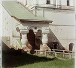 У левого края фотографии - монументальная ампирная Преподобенская колокольня Ризоположенского монастыря (1813-1819; сохранилась), а немного правее ее - башенка монастырской ограды, увенчанная куполом.
