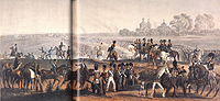 Во главе атакующей кавалерии скачет Мюрат. Густыми клубами дыма окутаны солдаты Неверовского, построившиеся в каре.